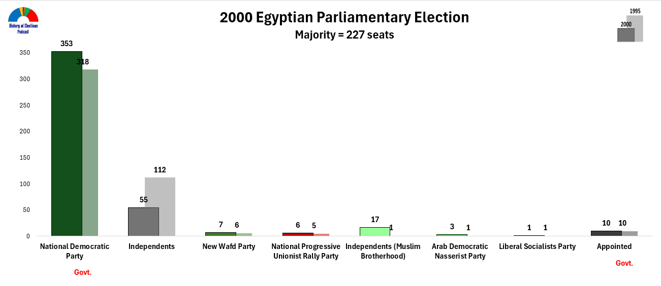 And what of Atef Ebeid, the Prime Minister who led the NDP into the 2000 election? He served as Prime Minister for five years, briefly acting as president for two weeks in 2004 while Mubarak received medical treatment in Germany. He was replaced as Prime Minister shortly afterwards—I assume not because of anything he did in those two weeks—and he went on to lead the Arab International Bank. However, he could not escape the drive for accountability that accompanied the 2011 revolution: he was removed from office after Mubarak’s overthrow over corruption allegations and, in 2012, was sentenced to ten years in prison. He died in 2014 at the age of 82.